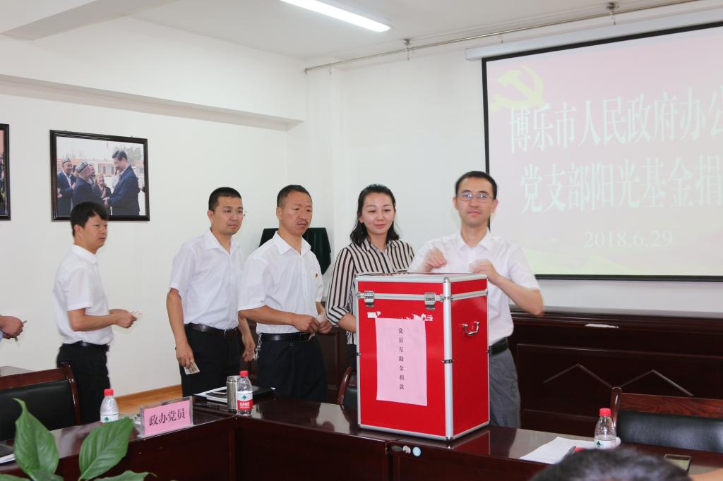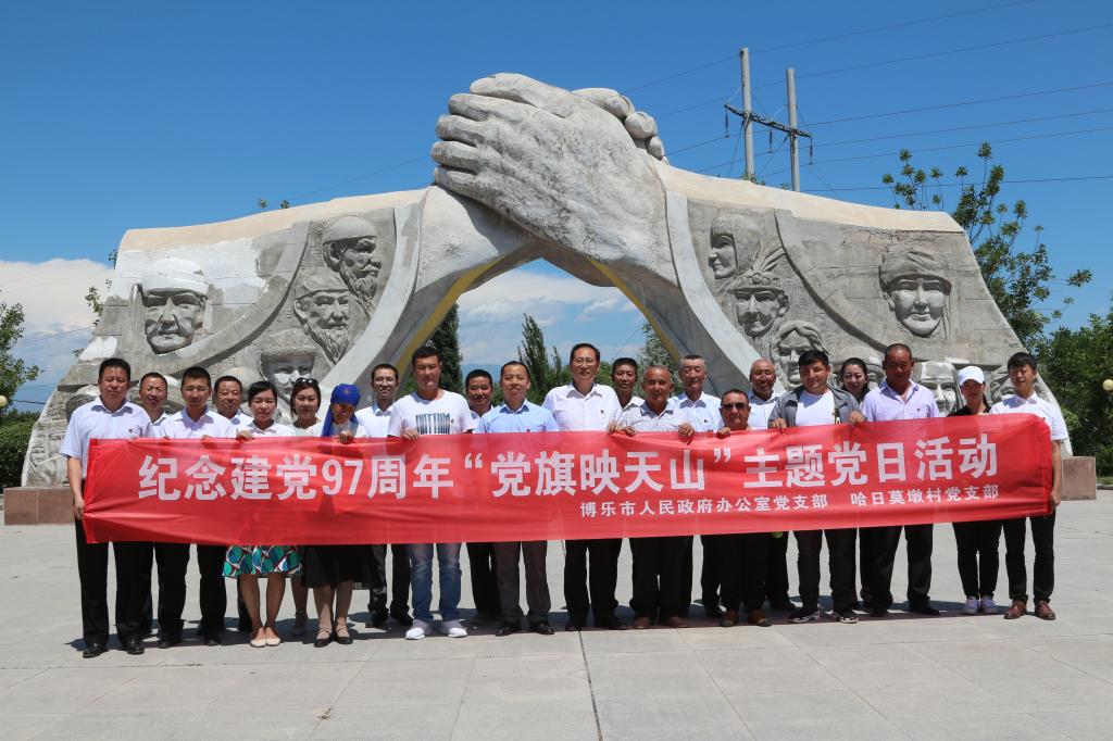 为纪念建党97周年,深入贯彻落实党的十九大精神和习近平新时代中国特色社会主义思想,常态化、制度化推进“两学一做”学习教育,2018年6月29日,博乐市人民政府办公室党支部和哈日莫墩村党支部全体党员、预备党员、入党积极分子、发展对象一起开展“党旗映天山”主题党日活动,重温入党誓词,加强党性教育,追寻红色记忆,强化使命担当,传承党的精神,增强理想信念。