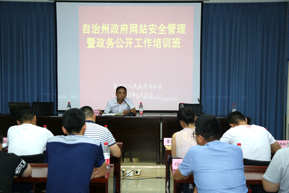 为认真贯彻落实国务院、自治区电子政务、政府网站管理、网络安全、政务公开的有关部署,6月21日,自治州政府网站安全管理及政务公开工作培训班在州政府办公楼一楼东会议室举办,来自各县市、州直各有关单位网站管理员、政务公开工作人员共计73人参加了培训。