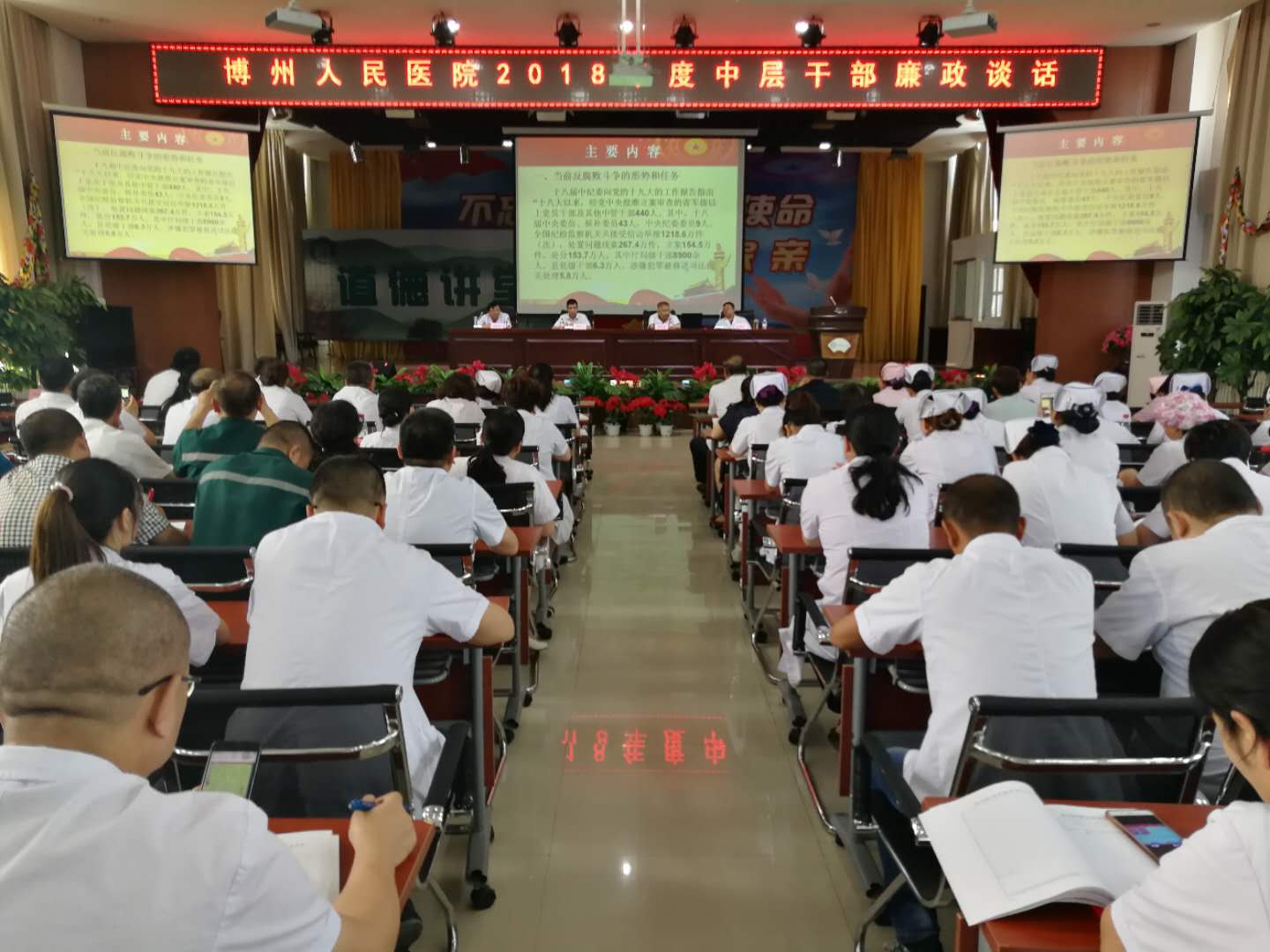 7月6日下午,博州人民医院召开2018年中层干部党风廉政建设集体谈话活动。州纪委、监委派驻州卫计委组长周克山、医院领导班子成员、全院中层干部、党员参加了会议。